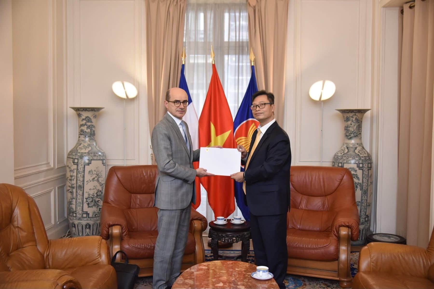 Đại sứ Trịnh Đức Hải trân trọng cảm ơn Bộ Châu Âu và Ngoại giao Pháp đã dành sự đón tiếp trọng thị và cử chỉ ngoại giao đầy thiện chí khi tiếp nhận bản sao Quốc thư ngay trong ngày đầu tiên Đại sứ có mặt tại Paris.